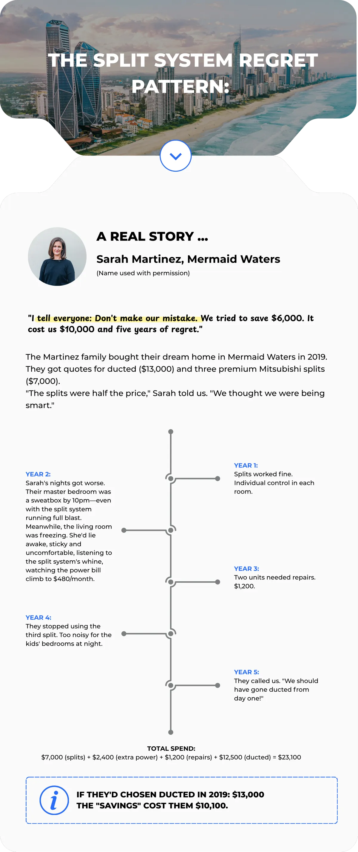 When you're lying in bed at 2am, unable to sleep in the heat, doing the math in your head: "If we'd just spent the extra $6,000 three years ago, we'd be comfortable right now. Instead, we're going to spend $12,000 to fix our mistake."